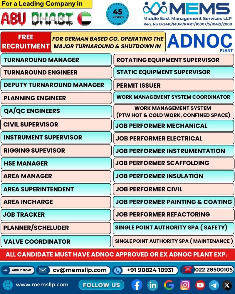 UAE : hiring for a Leading Company in Abu Dhabi For German Based Company Operating the Major Turnaround & Shutdown