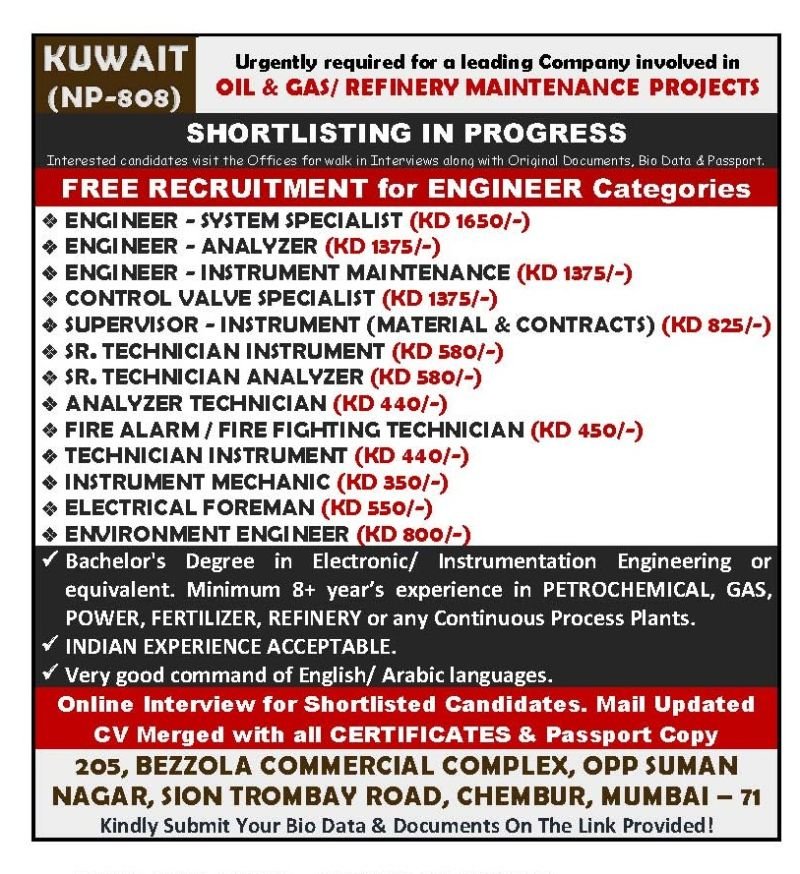 Kuwait : Hiring For Oil & Gas Refinery Maintenance Projects