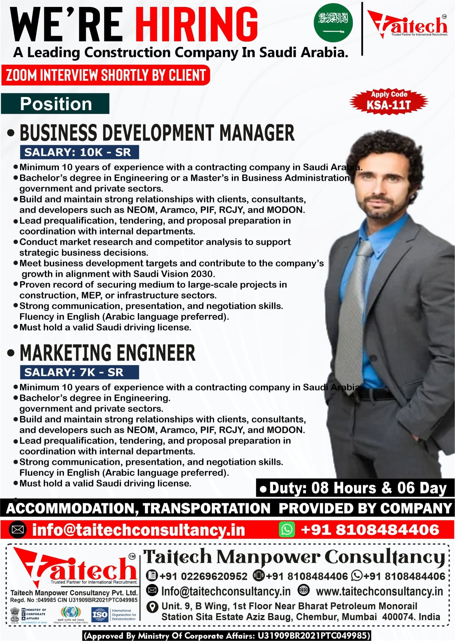 Business Development Manager & Marketing Engineer Jobs in Saudi Arabia – 10K+ SAR Salary