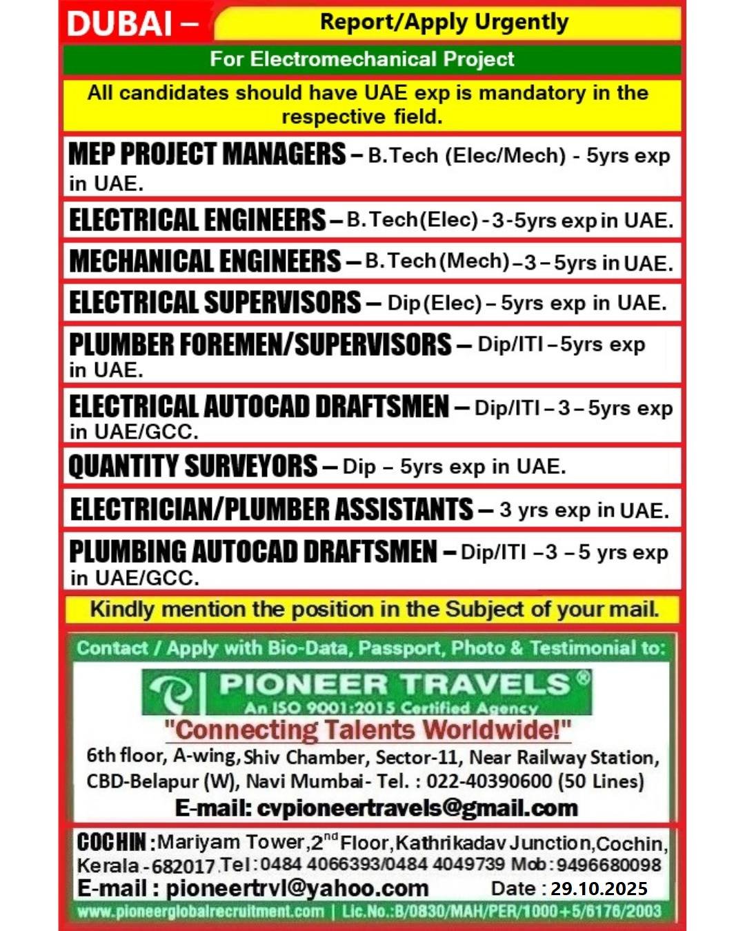 Dubai MEP Jobs: Electricians, Plumbers, Helpers – AED 1100–1800 | Online Interview Kochi Nov 5!