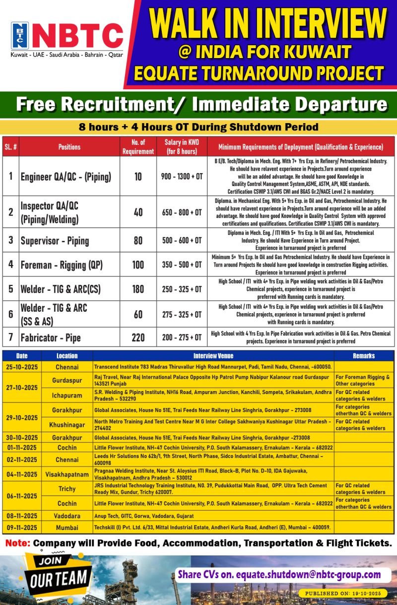 NBTC Kuwait Walk-In Interviews 2025: 700+ Jobs in Equate Turnaround Project – Free Recruitment, Food, Accommodation & Flights