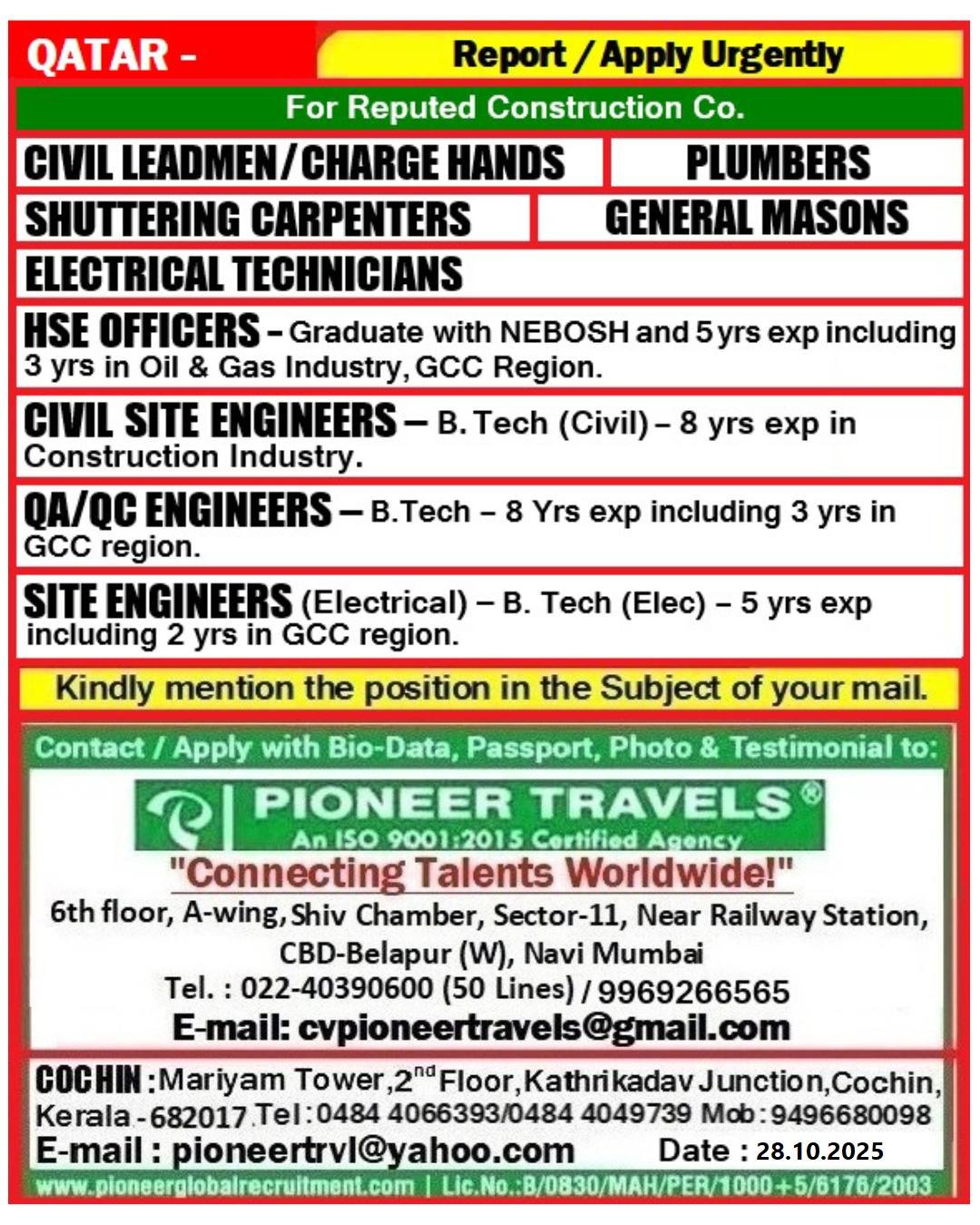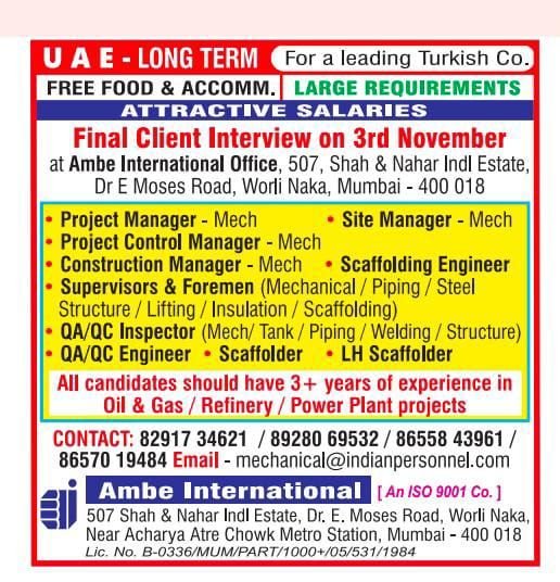 UAE Long Term Jobs: Project Manager, QA/QC, Scaffolding Engineer & More – Turkish Company | Client Interview Nov 3, Mumbai
