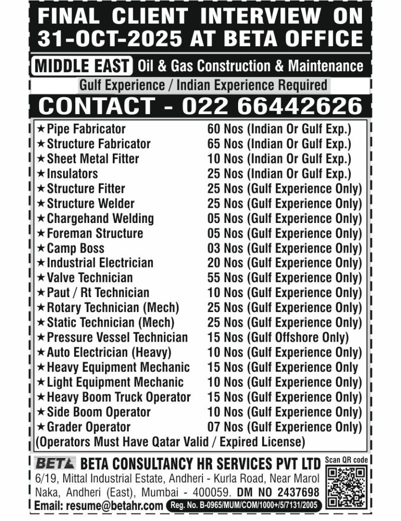 Middle East Oil & Gas Jobs: Pipe Fabricator, Welder, Valve Tech & More – Final Client Interview Oct 31!