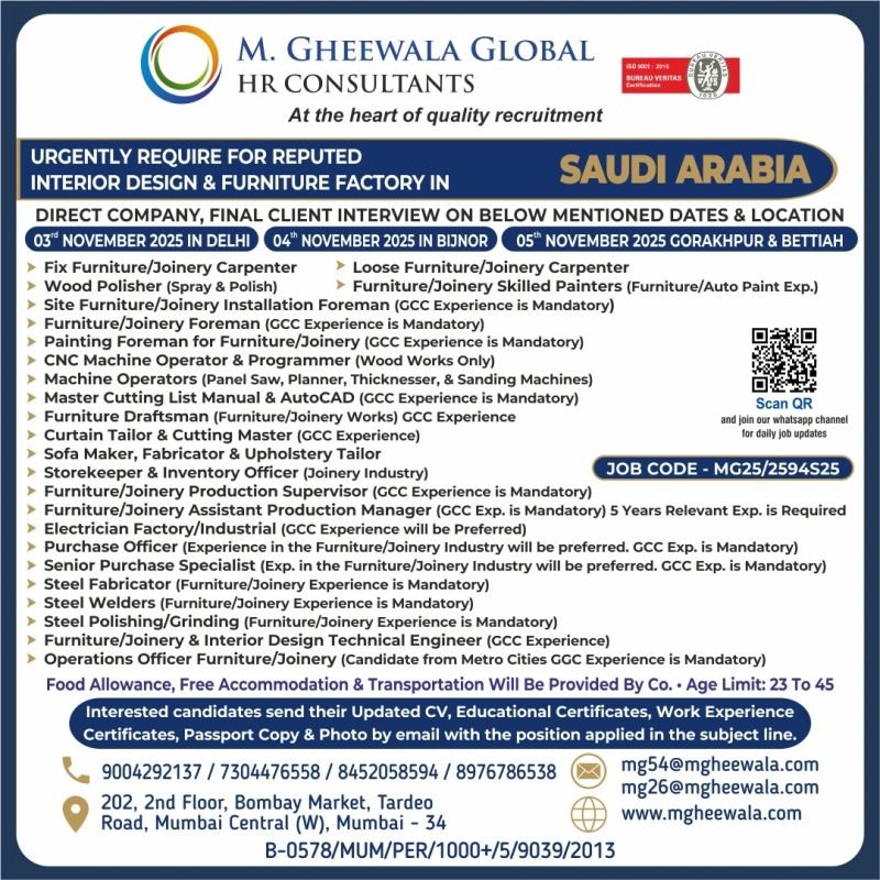 Saudi Arabia – Urgent Hiring for Reputed Interior Design & Furniture Factory