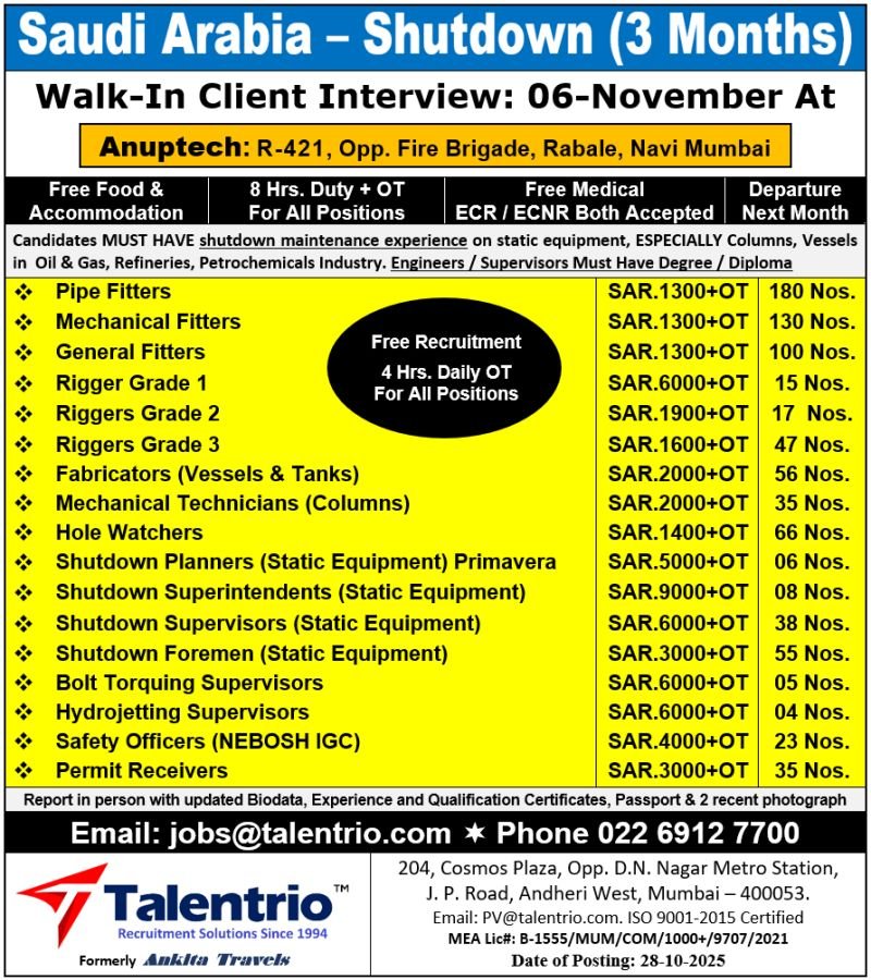 Saudi 3-Month Shutdown Jobs: Rigger, Fitter, Planner – Walk-In Nov 6, Navi Mumbai | Free Food + Daily OT!