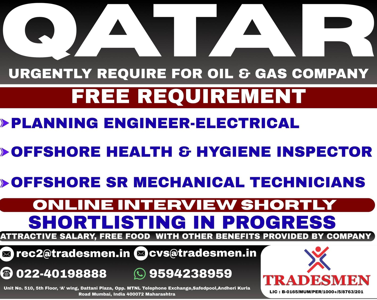 Qatar Oil & Gas Jobs: Planning Engineer Electrical, Offshore Health Inspector & Sr Mechanical Tech – Free Recruitment!