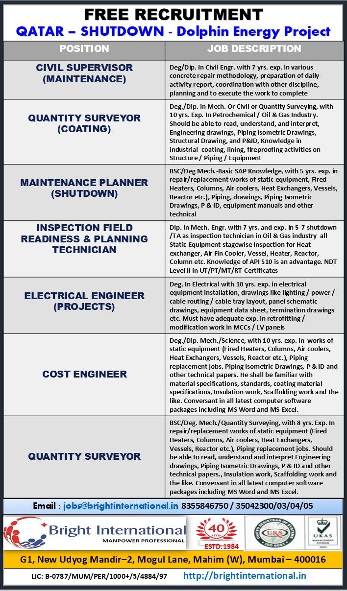 Free Recruitment: Qatar Shutdown Jobs – Dolphin Energy Project | Civil, Quantity Surveyor, Electrical & More – Apply Now!