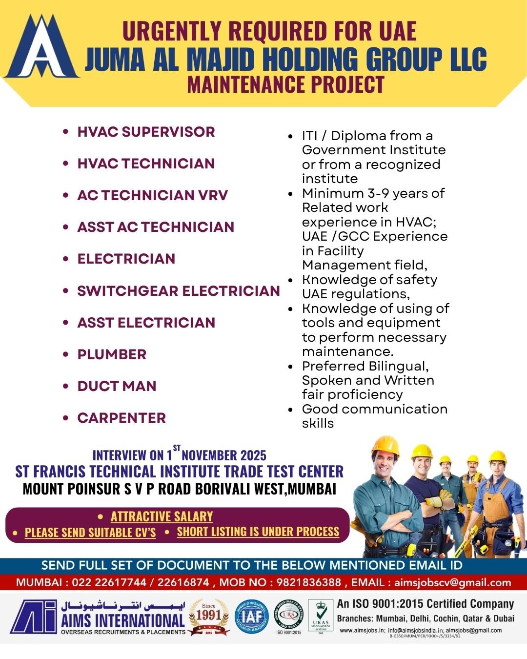 UAE – Urgent Requirement for Juma Al Majid Holding Group LLC – Maintenance Project