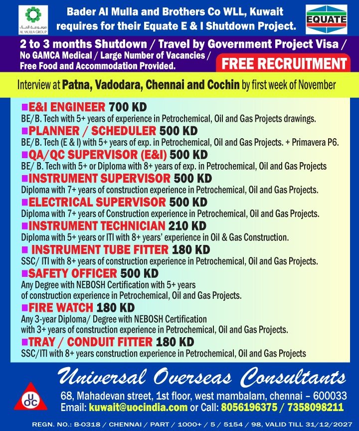 Kuwait : Job Opportunities at Bader Al Mulla for Equate E & I Shutdown Project