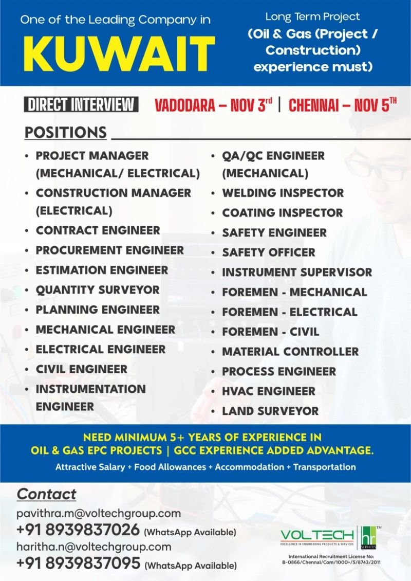 Kuwait & UAE : Job Vacancies For a leading Oil & Gas Construction, Construction & Maintenance company