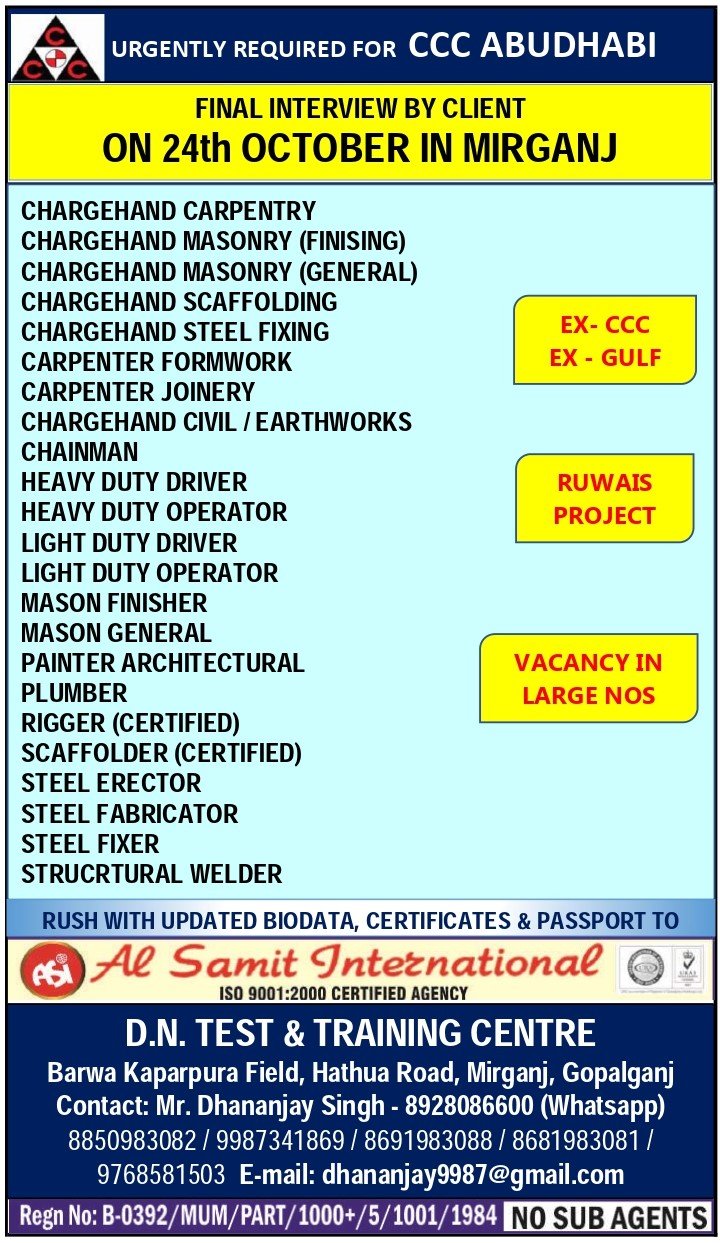 Urgent Job Vacancies For Ccc Abu Dhabi – Ruwais Project
