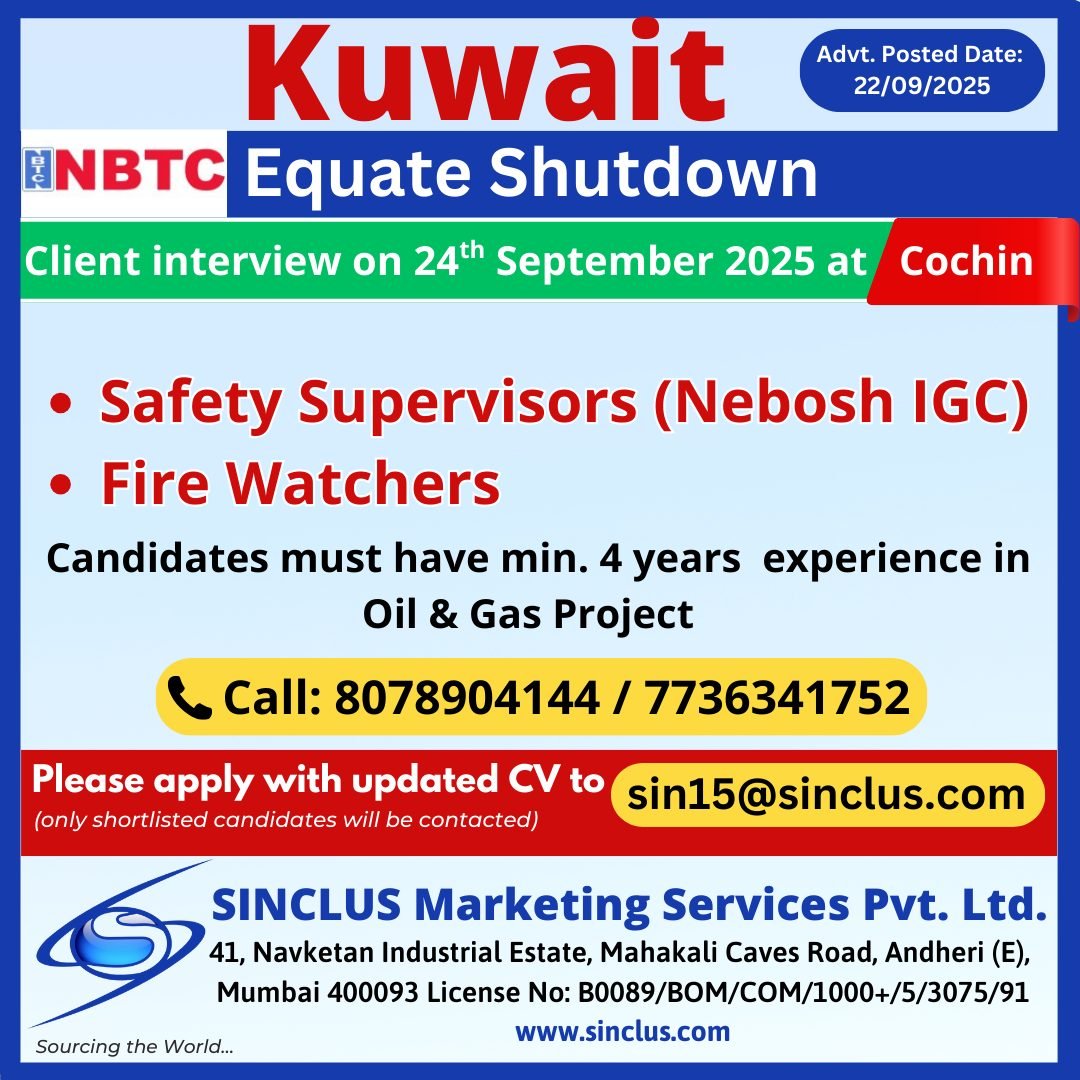 Kuwait NBTC Equate Shutdown Jobs – Safety Supervisors & Fire Watchers