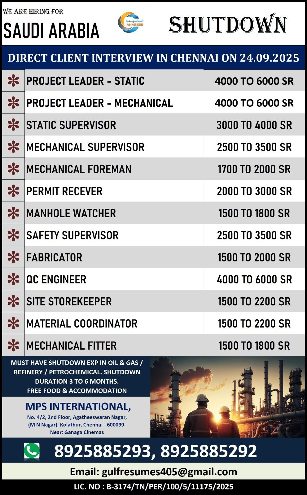 Job Opportunities in Saudi Arabia for Shutdown Projects – Direct Interview