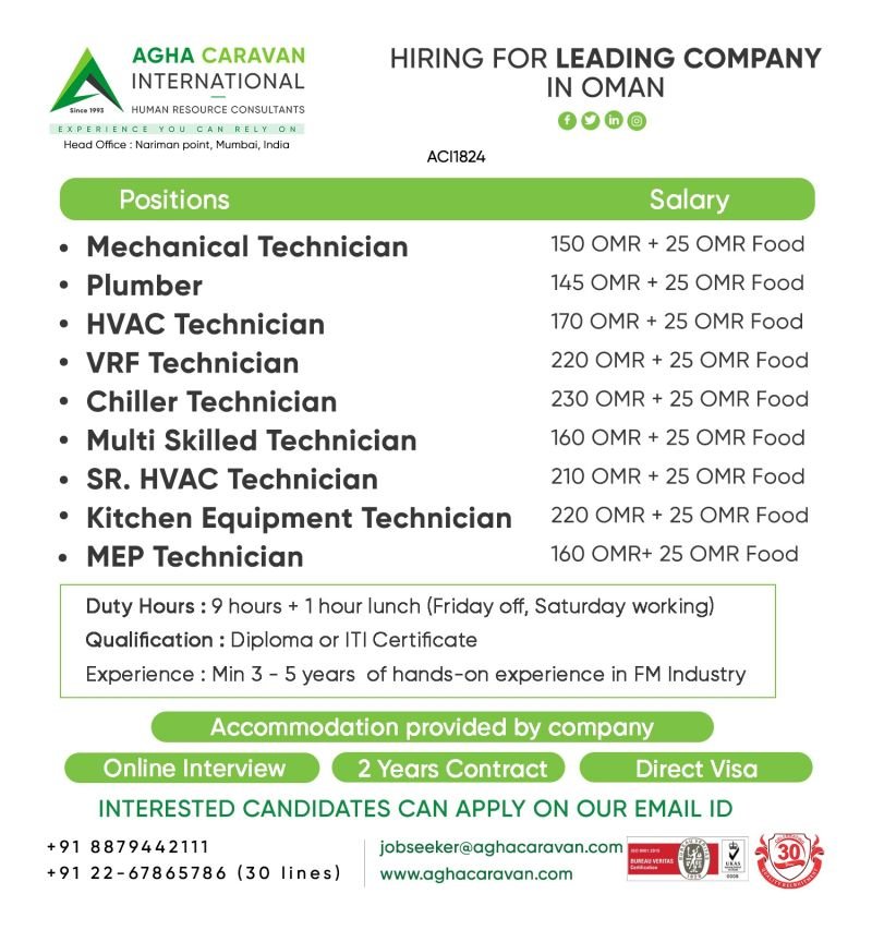 Jobs in Saudi Arabia – Urgently required for O&M Company