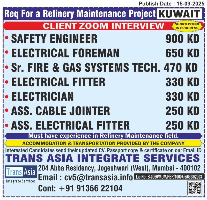 Career Opportunity in KUWAIT – Refinery Maintenance Project