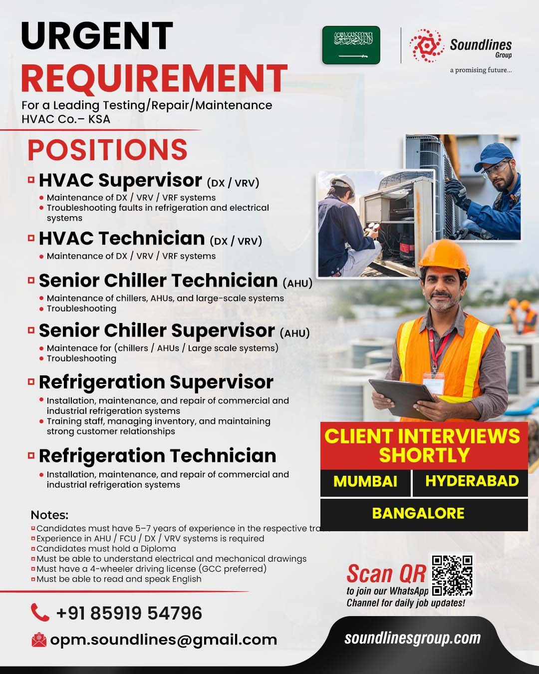 Recruitment For a Leading Testing/Repair/Maintenance HVAC Co.- Saudi Arabia