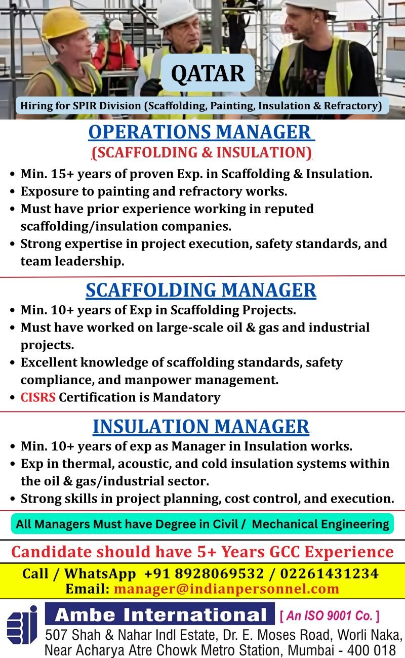 Jobs in Qatar – Hiring for SPIR Division (Scaffolding, Painting, Insulation & Refractory)  – Apply Now!