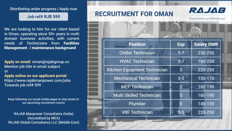 Hiring Technicians for Oman – Facilities Management / Maintenance background.