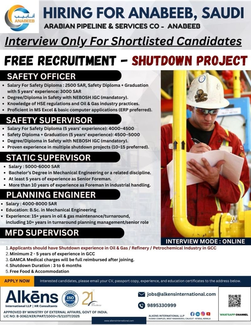 Free Recruitment For ANABEEB Saudi Arabia – Shutdown Project