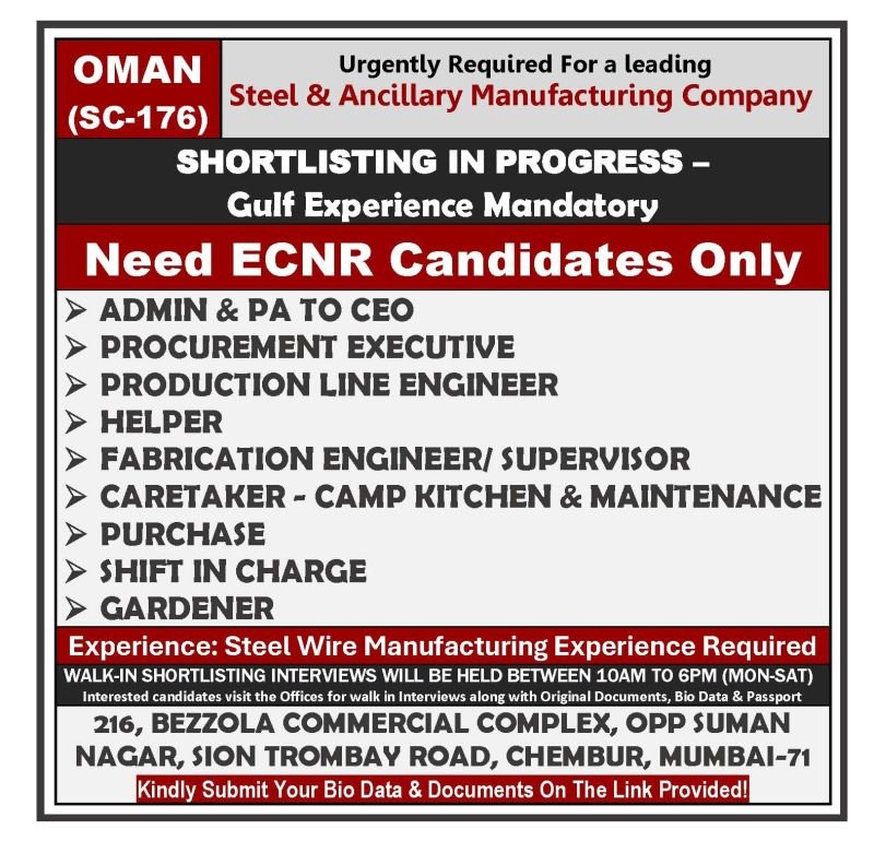 Oman – Urgently Hiring For Steel & Ancillary Manufacturing Company