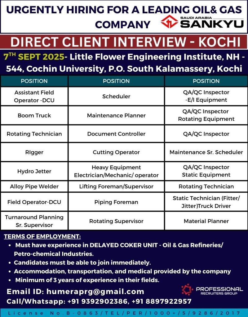 Urgent Hiring For Saudi Arabia SANKYU – Oil & Gas Industry