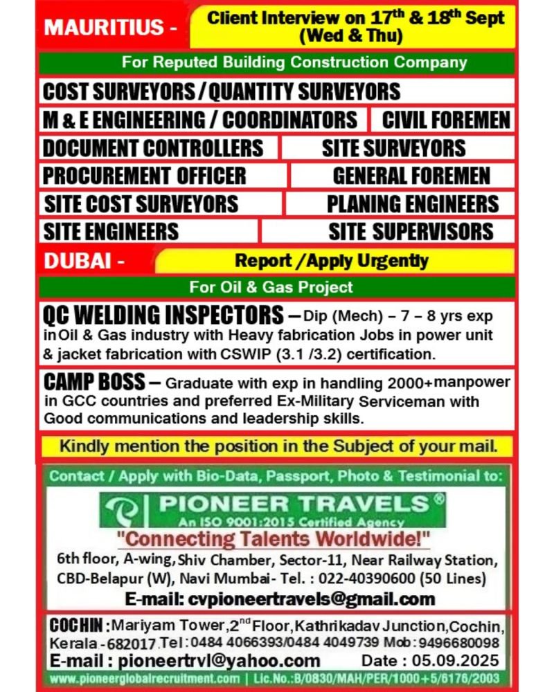 Urgent Hiring For Mauritius & Dubai