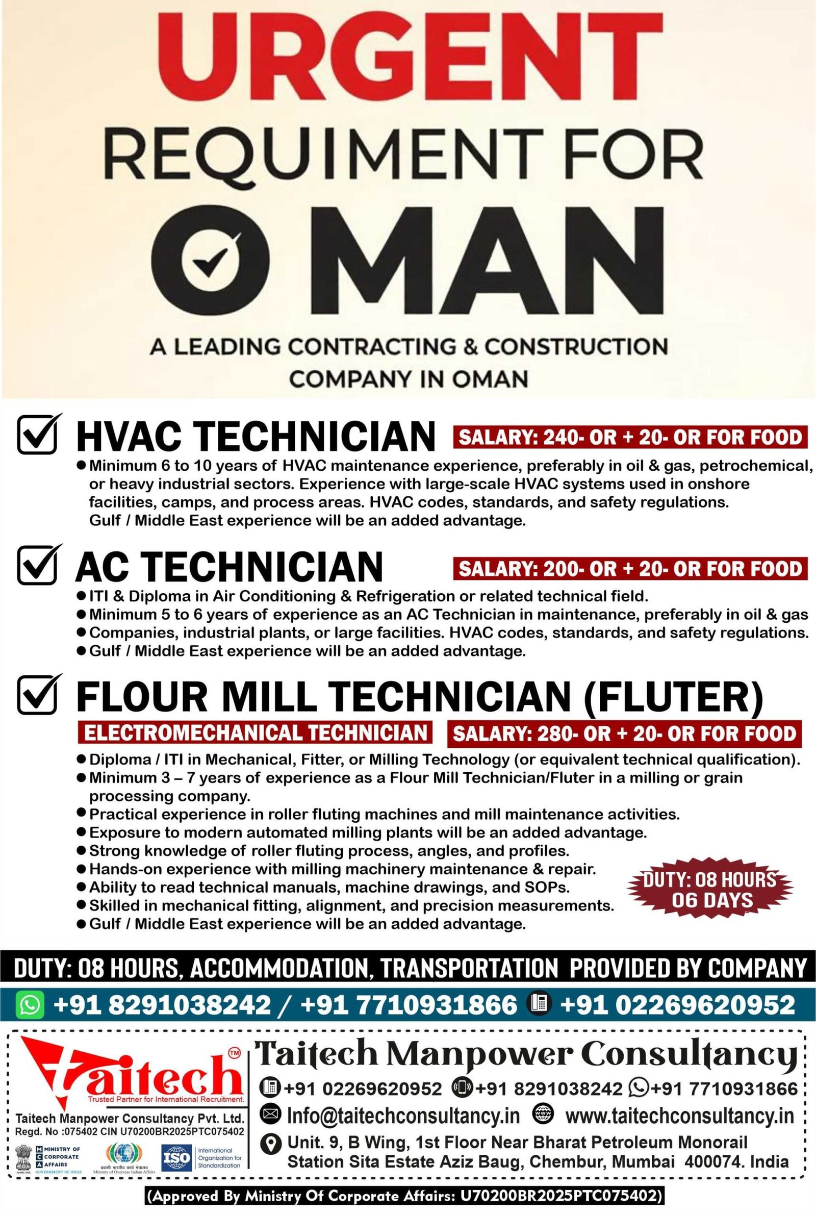 Urgent Requirement for Oman – Leading Contracting & Construction Company