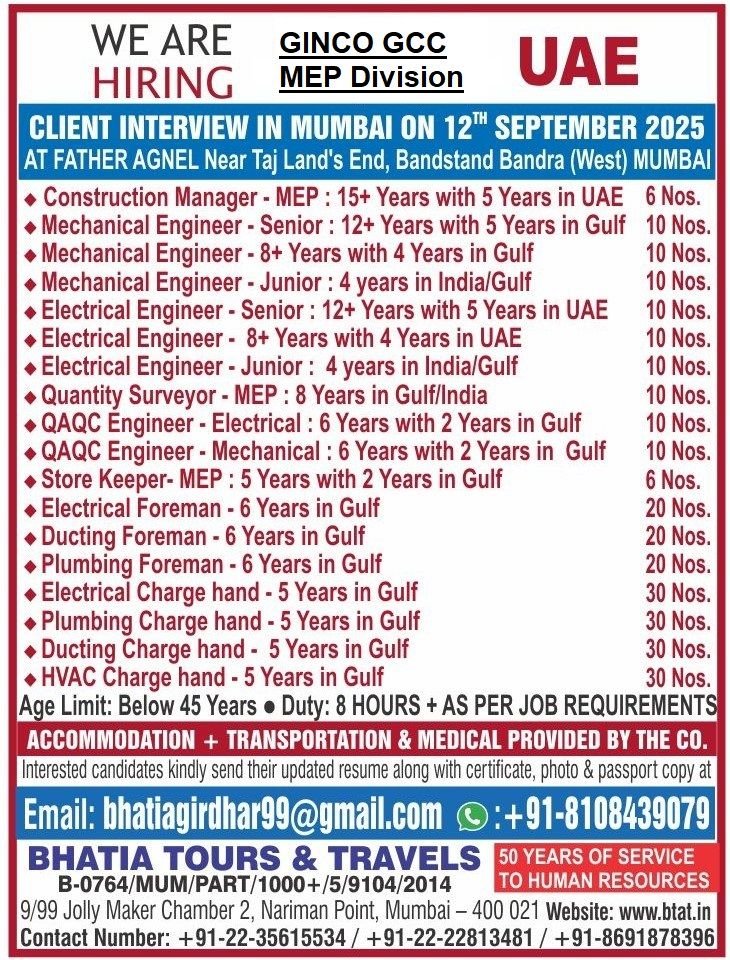 UAE – Urgent Hiring by Ginco GCC MEP Division