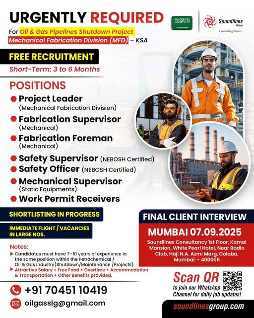 Saudi Arabia – Recruitment For Oil & Gas Pipelines Shutdown Project