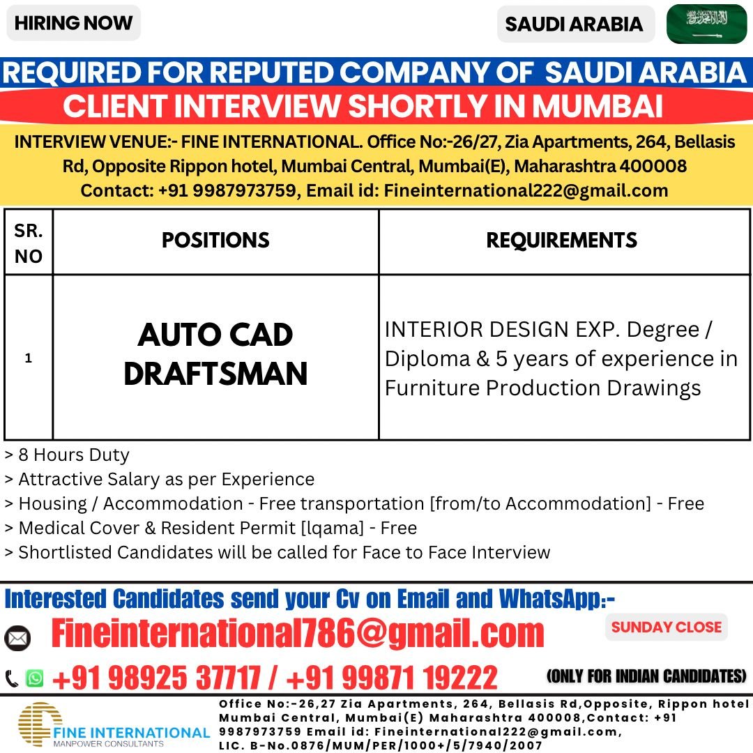 Hiring Auto CAD Draftsman for Reputed Company in Saudi Arabia