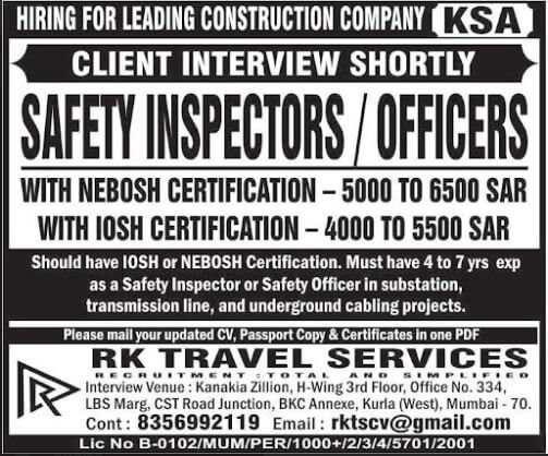 Saudi Arabia – Hiring Safety Inspectors / Officers for Leading Construction Company