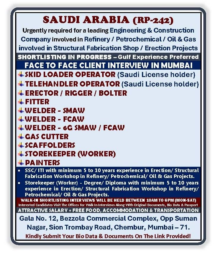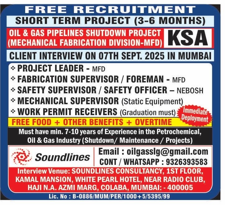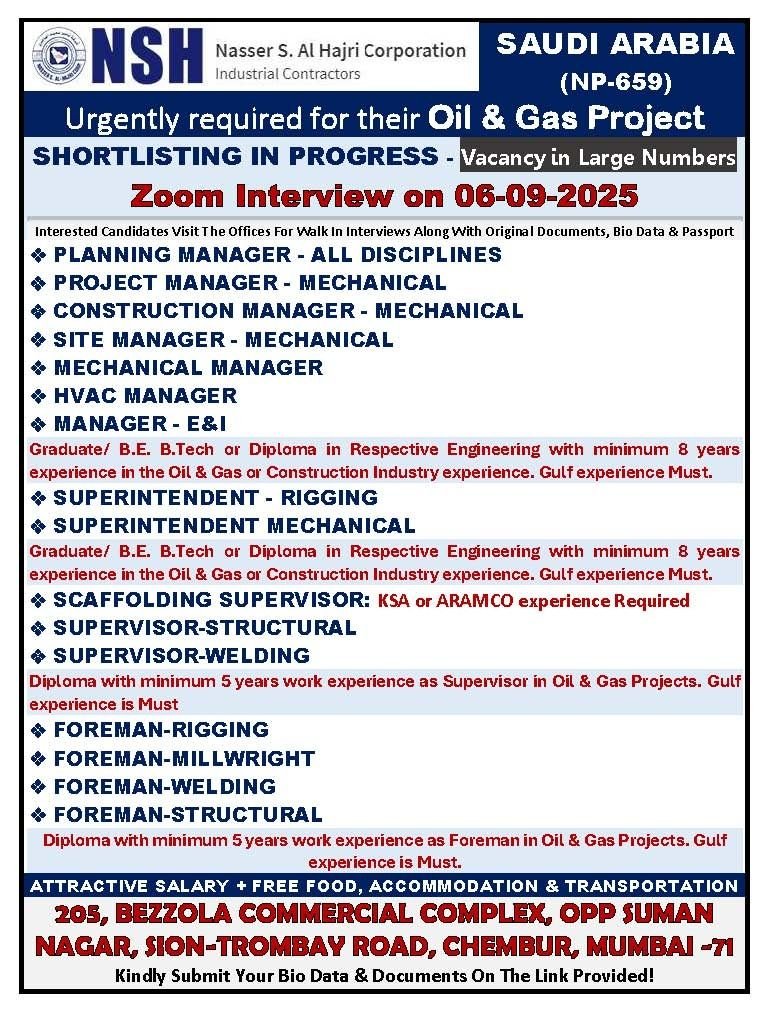 Saudi Arabia – Urgently hiring skilled professionals for Oil & Gas Projects .