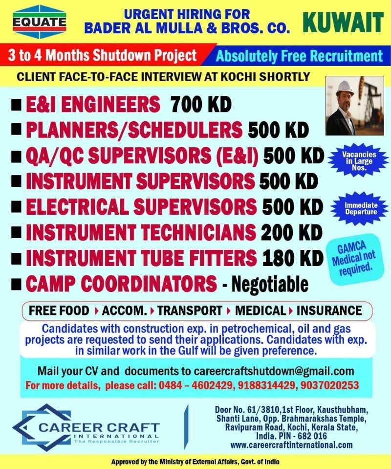 Kuwait Shutdown Project Jobs – Urgent Hiring by Equate Bader Al Mulla & Bros. Co.