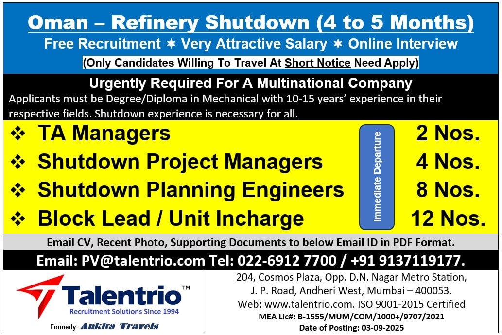 Oman Refinery Shutdown Jobs (4 to 5 Months) – Immediate Hiring