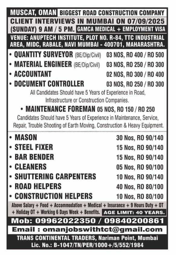 Muscat, Oman Road Construction Jobs – Urgent Hiring