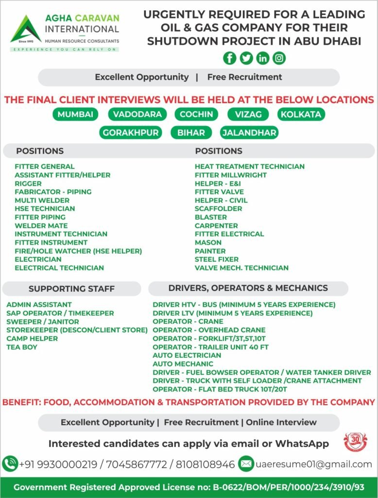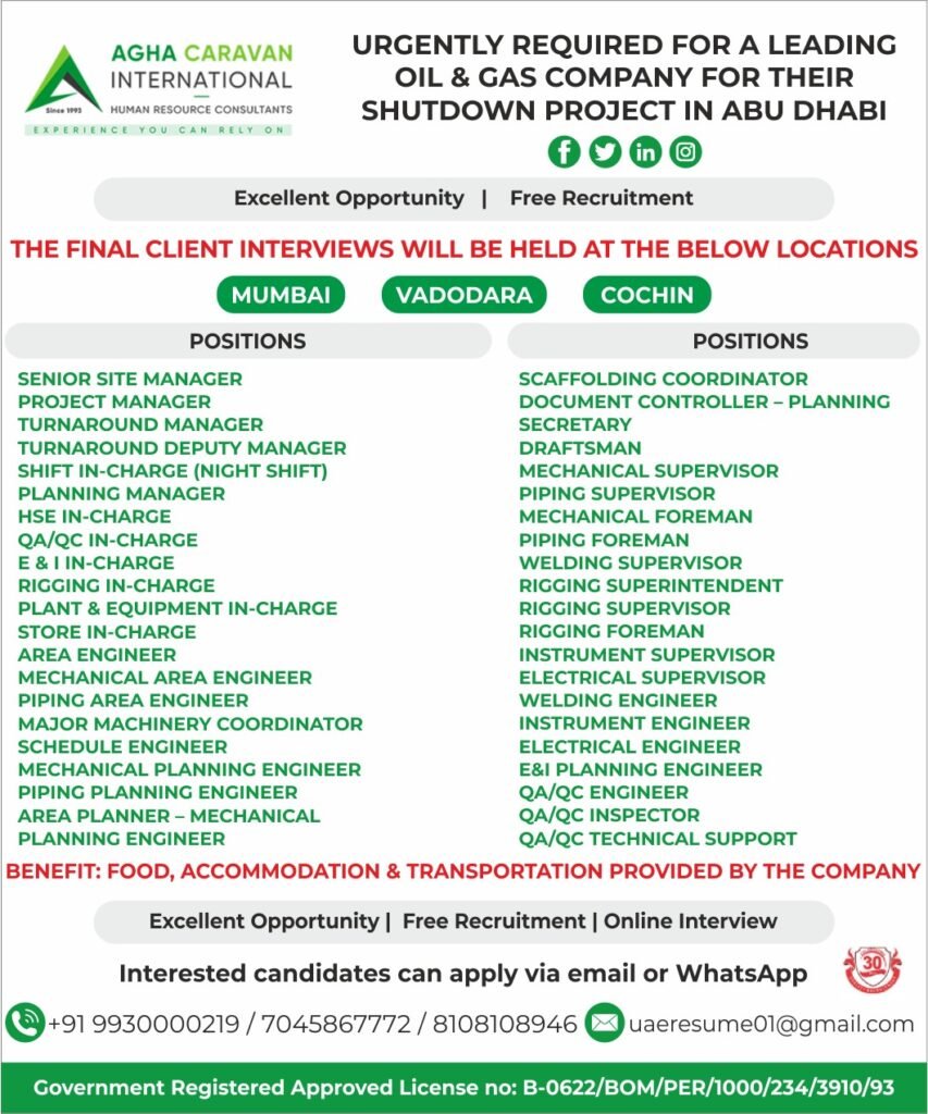 A leading Oil & Gas company in Abu Dhabi (UAE) is urgently hiring professionals for a shutdown project. The recruitment is conducted by Agha Caravan International Human Resource Consultants, offering free recruitment and excellent career opportunities.