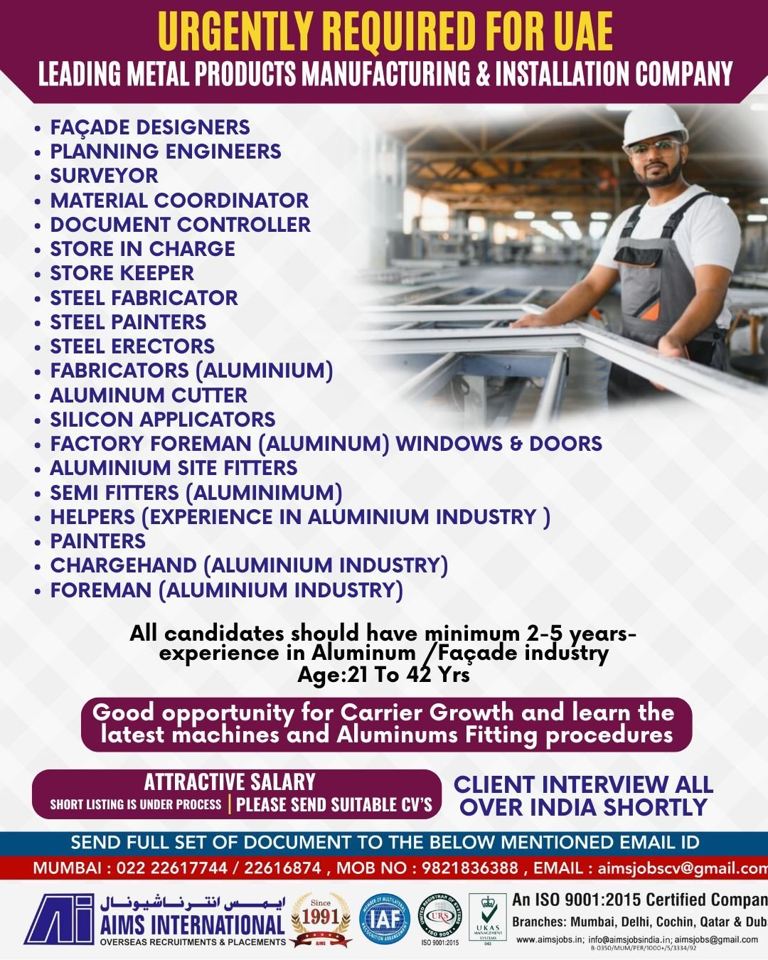 Age: 21–42 years Must Have: Minimum 2–5 years experience in Aluminium/Façade industry