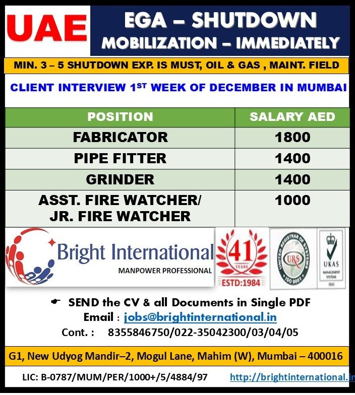 Urgent hiring for EGA shutdown in UAE! Experienced oil & gas maintenance professionals needed for immediate mobilization. Client interviews in Mumbai – 3-5 years shutdown experience MANDATORY.
