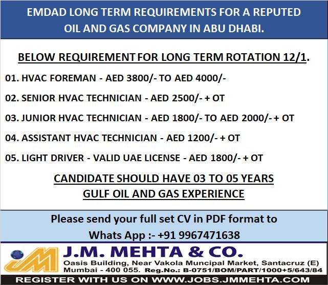 - Junior HVAC Technician – AED 1800/- to AED 2000/- + OT