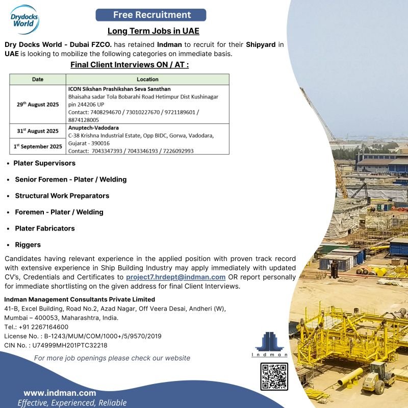 Dry Docks World – Dubai FZCO. has retained Indman to recruit for their Shipyard in UAE is looking to mobilize the following categories on immediate basis.