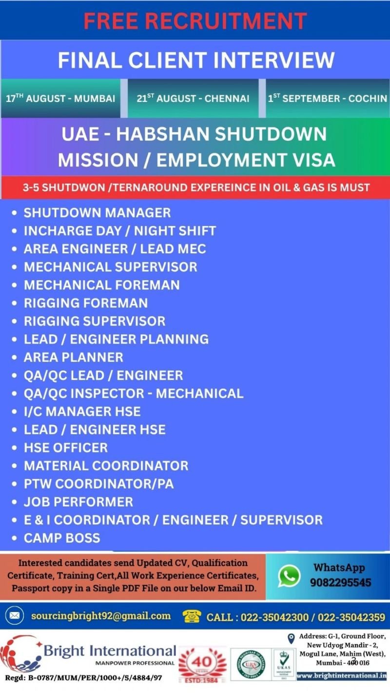 Bright International Manpower Professional is excited to announce free recruitment opportunities for the Habshan Shutdown mission in UAE. Final client interviews are scheduled for 17th August in Mumbai, 21st August in Chennai, and 1st September in Cochin. This is your chance to secure an employment visa with a focus on shutdown/turnaround experience in oil & gas.