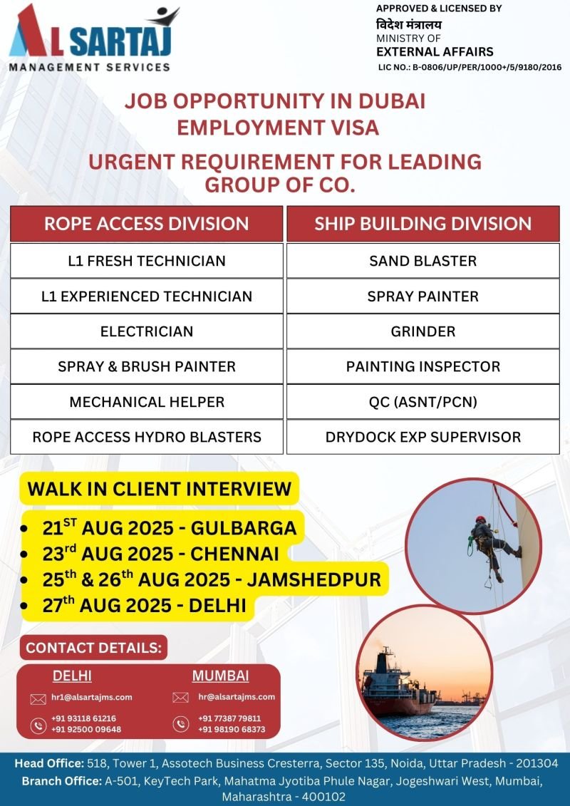 Explore exciting career prospects with a leading group of companies in Dubai. Al Sartaj Management Services is conducting walk-in client interviews for the Rope Access and Ship Building Divisions. Secure your employment visa and join now!