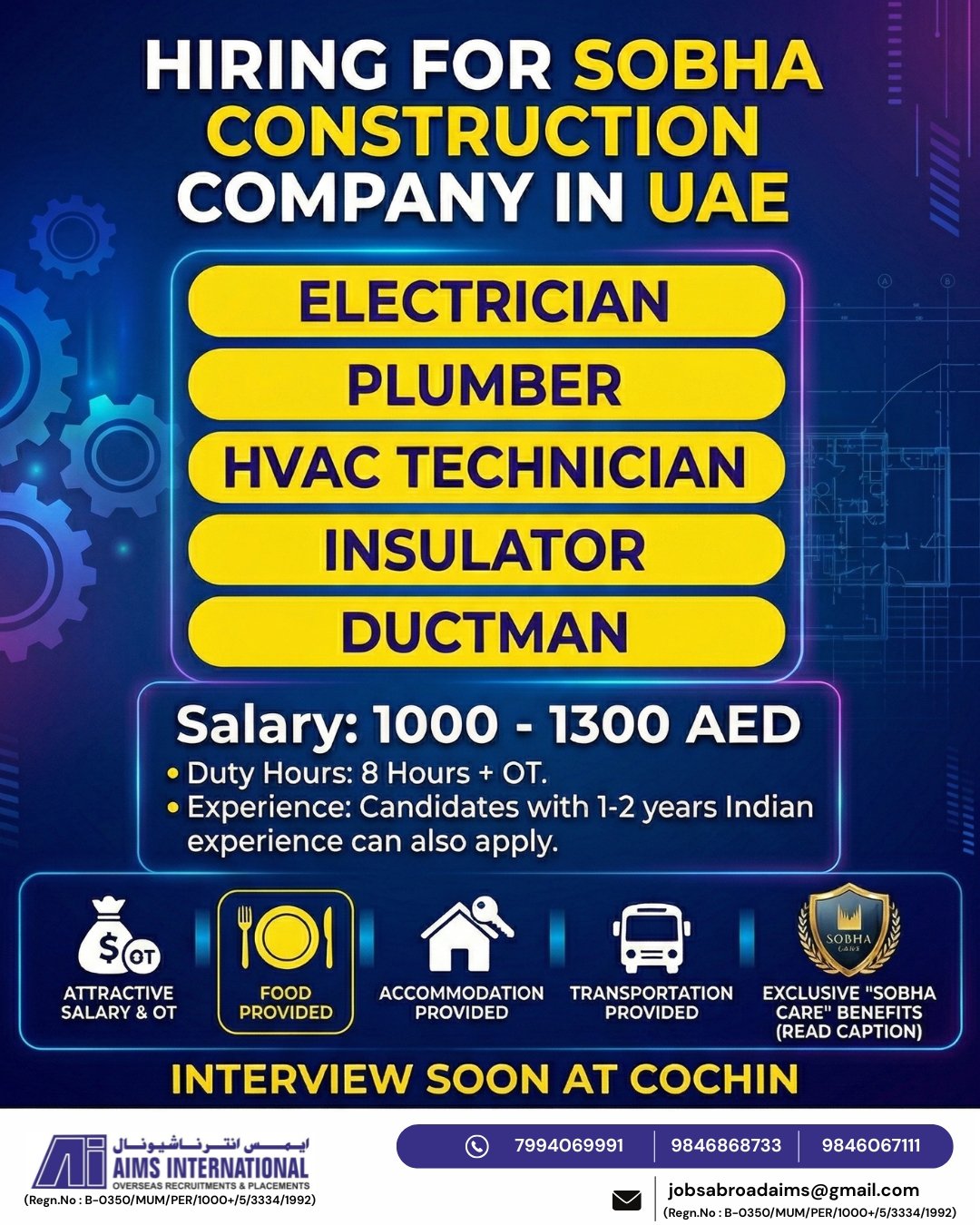 A reputed construction company, Sobha Construction, in the United Arab Emirates (UAE) is hiring skilled and semi-skilled workers for multiple roles. This is a great opportunity for candidates looking for Gulf jobs with free benefits and overtime.