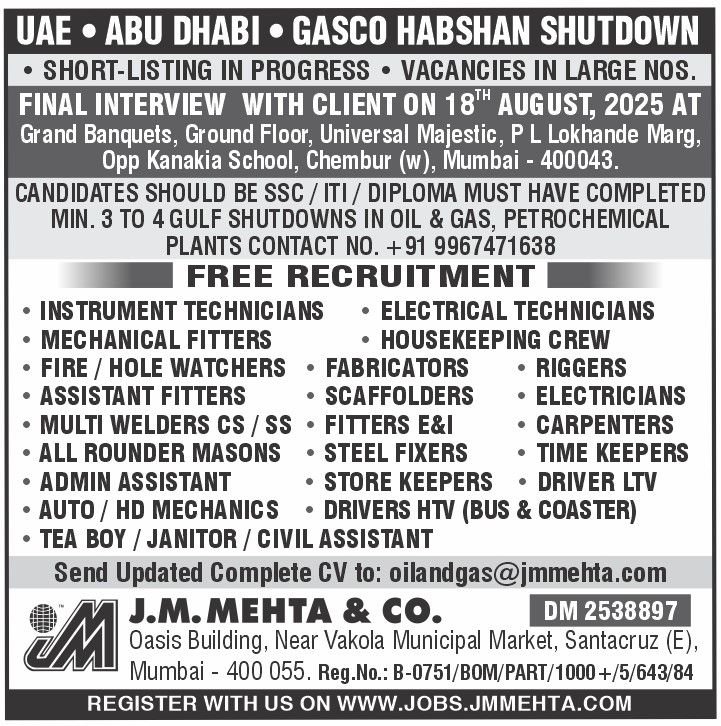 J.M. Mehta & Co. is conducting a final interview with the client on 18th August 2025 for the GASCO Habshan Shutdown in Abu Dhabi, UAE. Short-listing is in progress with vacancies in large numbers. This is a free recruitment opportunity.