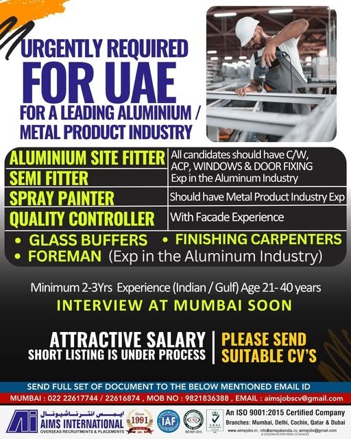 AIMS International Overseas Placements is urgently recruiting for a leading aluminum/metal product industry in UAE. An interview at Mumbai is scheduled soon, with shortlisting currently under process. Apply now for attractive salaries!