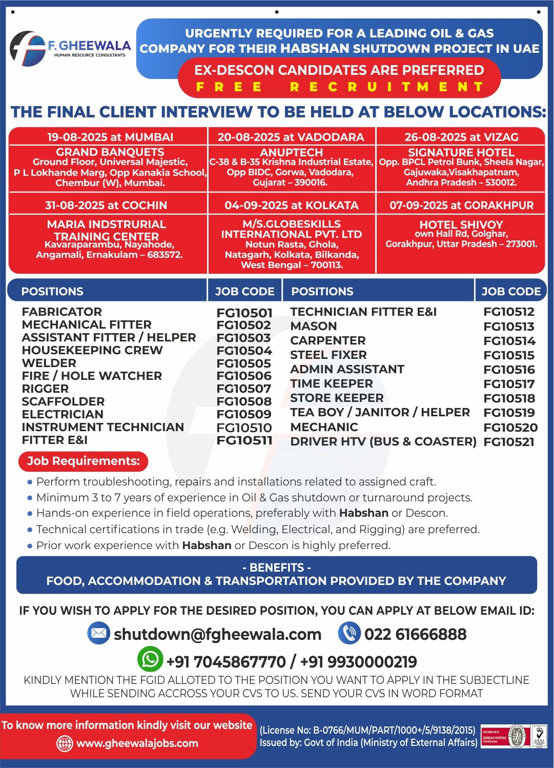 F.Gheewala Human Resource Consultants is urgently recruiting for a leading oil & gas company’s Habshan Shutdown Project in UAE. Ex-Descon candidates are preferred. Free recruitment—apply now!
