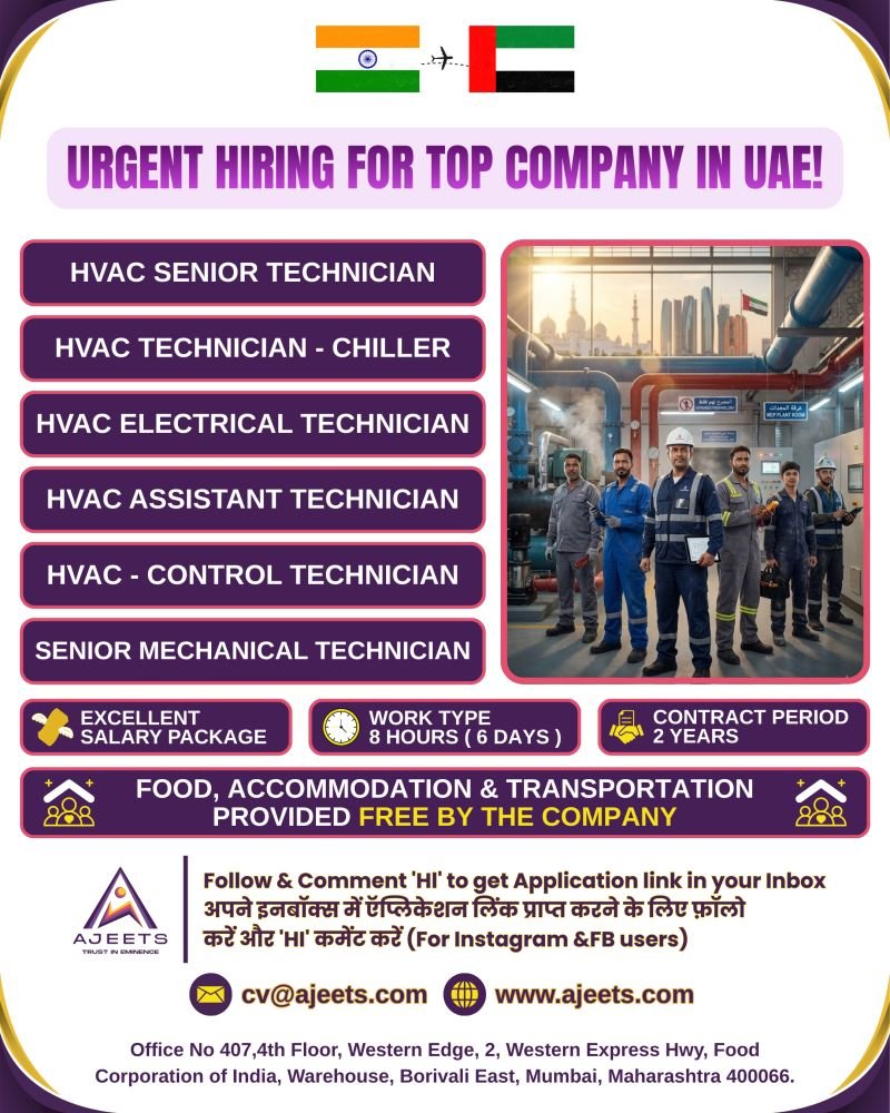 We are looking for HVAC Senior Technicians, Chiller Technicians, Electrical Technicians, Control Technicians, and Mechanical Technicians for immediate deployment.