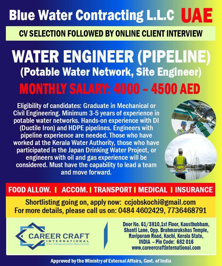 UAE – Water Engineer (Pipeline) Jobs at Blue Water Contracting LLC