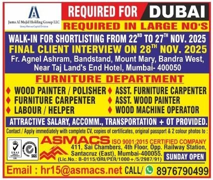 Juma Al Majid Holding Group LLC – One of the largest and most reputed business groups in UAE is urgently hiring for their furniture manufacturing unit in Dubai.