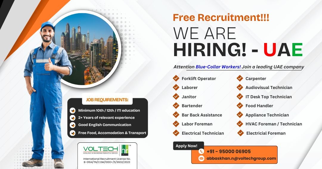 Are you a skilled blue-collar worker seeking stable employment in the UAE? A leading company in the United Arab Emirates is urgently hiring experienced professionals through Voltech HR Services Pvt Ltd, a trusted and government-licensed international recruitment agency.